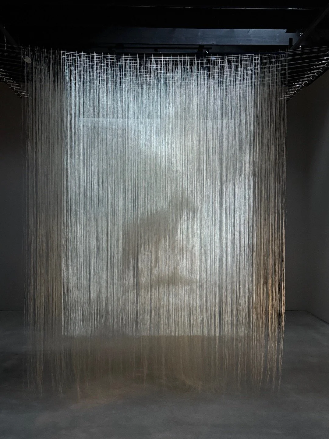 Constructed of white horse hair, a suspended cubic form floats in the center of the space, simultaneously absorbing and fragmenting two video projections, exuding a sense of both permeability and impenetrability. The work makes formal and metaphorical use of two aspects inherent to the material hair – that it stirs like breath with air movement, and that it gathers light and becomes a luminous presence.